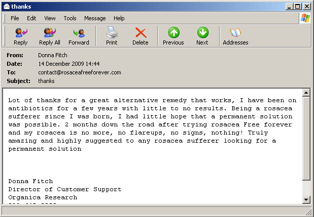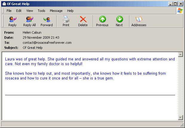 "Wanted to send you a fast mail to let you know what a wonderful feeling is to have a clear face again. Can't really believe how simple and effective it was to finally get rid of my rosacea, at last! Wishing you the best for your service."