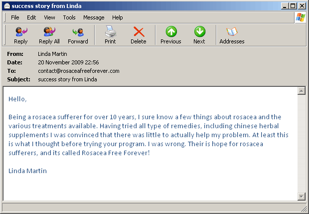 "Being a rosacea sufferer for over 10 years, I sure know a few things about rosacea and the various treatments available. Having tried all type of remedies, including chinese herbal supplements I was convinced that there was little to actually help my problem. At least this is what I thought before trying your program. I was wrong. Their is hope for rosacea sufferers, and its called Rosacea Free Forever!"