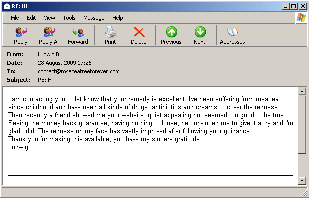 "I am contacting you to let know that your remedy is excellent. I've been suffering from rosacea since childhood and have used all kinds of drugs, antibiotics and creams to cover the redness. Then recently a friend showed me your website, quiet appealing but seemed too good to be true. Seeing the money back guarantee, having nothing to loose, he convinced me to give it a try and I'm glad I did. The redness on my face has vastly improved after following your guidance. Thank you for making this available, you have my sincere gratitude"