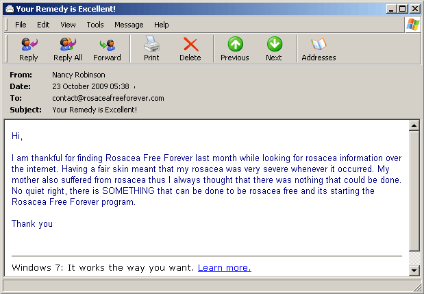 "I am thankful for finding Rosacea Free Forever last month while looking for rosacea information over the internet. Having a fair skin meant that my rosacea was very severe whenever it occurred. My mother also suffered from rosacea thus I always thought that there was nothing that could be done. No quiet right, there is SOMETHING that can be done to be rosacea free and its starting the Rosacea Free Forever program. Thank you"