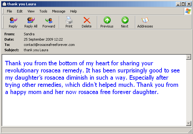 "Thank you from the bottom of my heart for sharing your revolutionary rosacea remedy. It has been surprisingly good to see my daughter's rosacea diminish in such a way. Especially after trying other remedies, which didn't helped much. Thank you from a happy mom and her now rosacea free forever daughter."